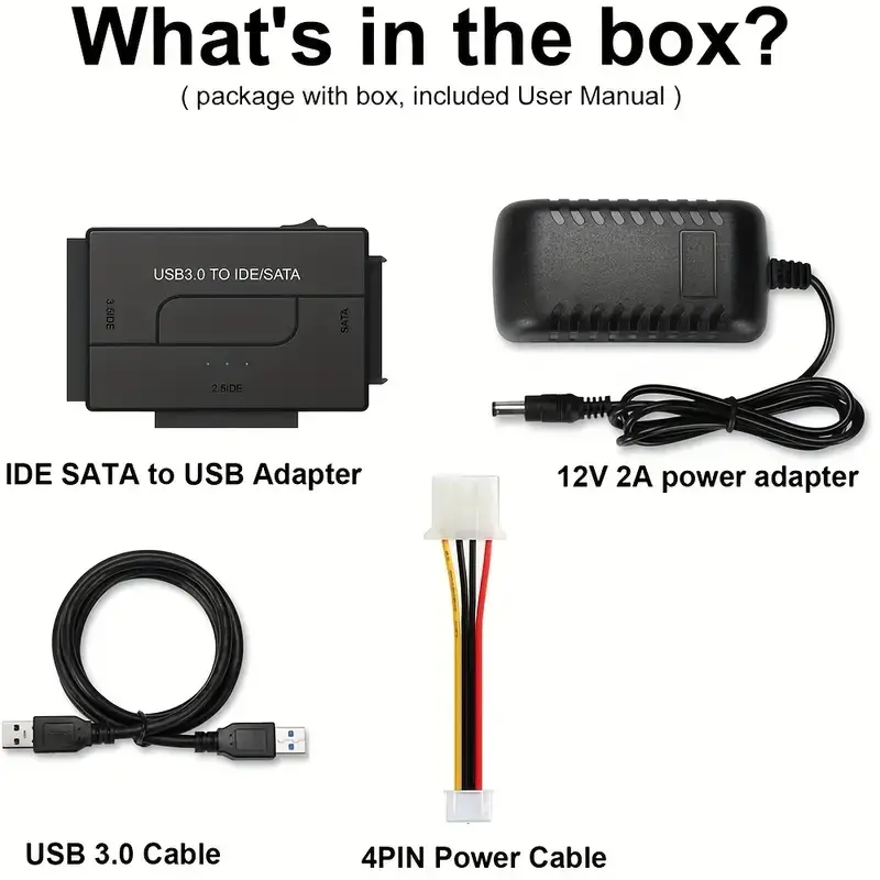 • Contenu de la boîte : Adaptateur USB 3.0 SATA/IDE, câble USB 3.0, adaptateur alimentation 12V 2A, câble 4PIN power, manuel utilisateur